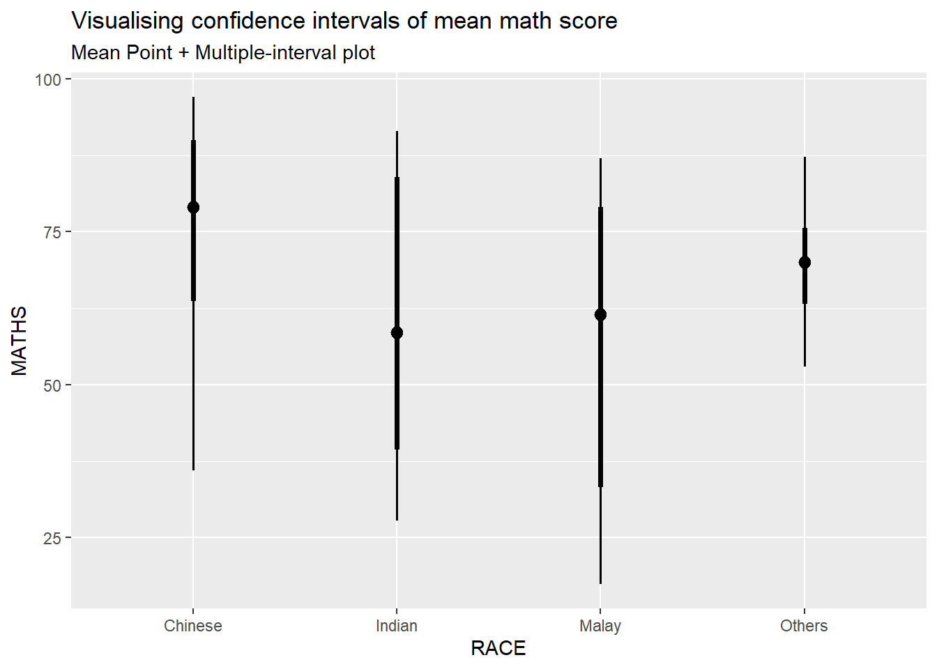 In the code chunk below, the Maths scores is binned into a 4-class variable by using cut().