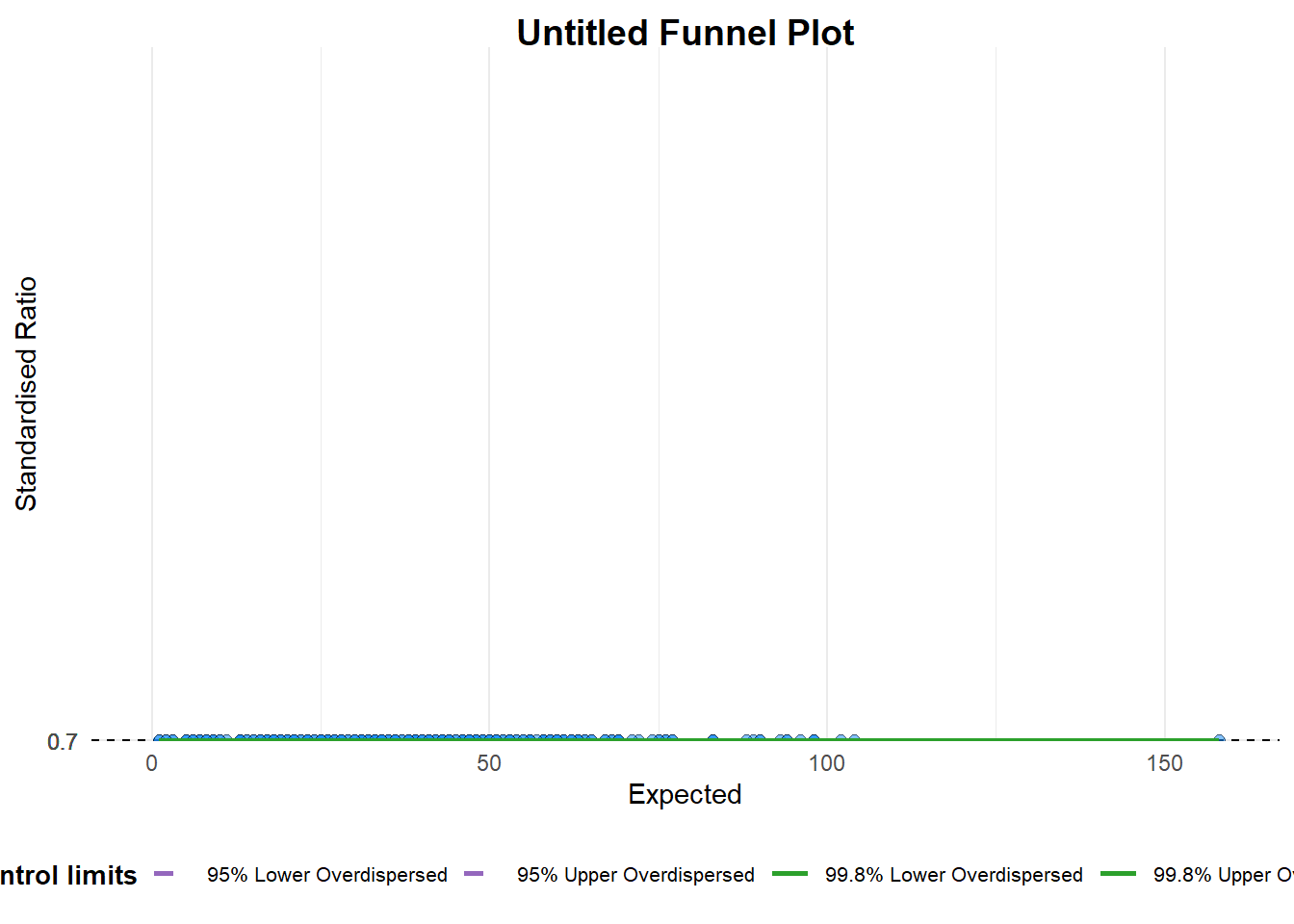 FunnelPlotR package uses ggplot to generate funnel plots. It requires a numerator (events of interest), denominator (population to be considered) and group. The key arguments selected for customisation are: