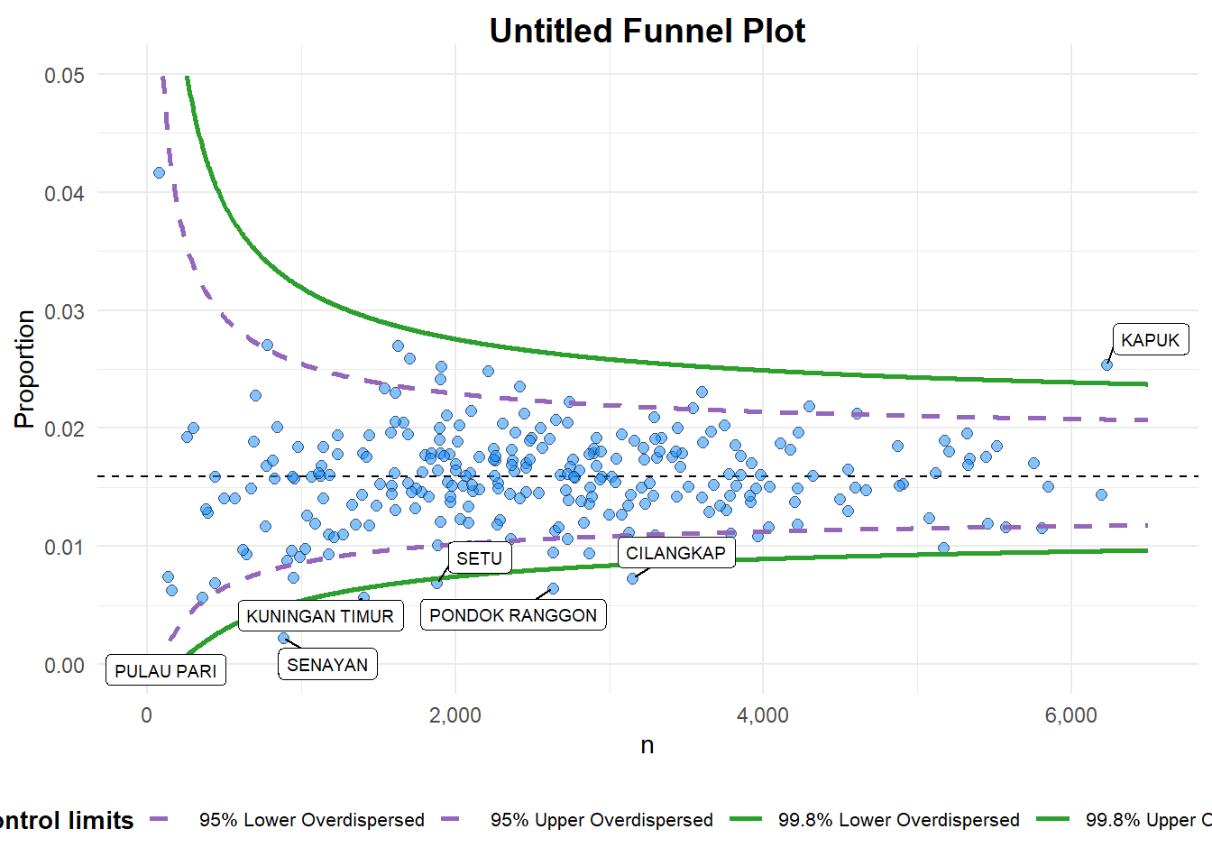 In the code chunk below, ggplot2 functions are used to plot a static funnel plot.