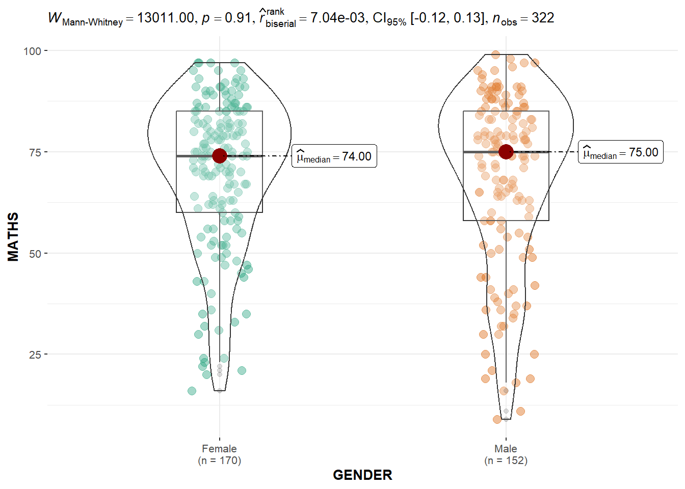 In the code chunk below, ggbetweenstats() is used to build a visual for two-sample mean test of Maths scores by gender.