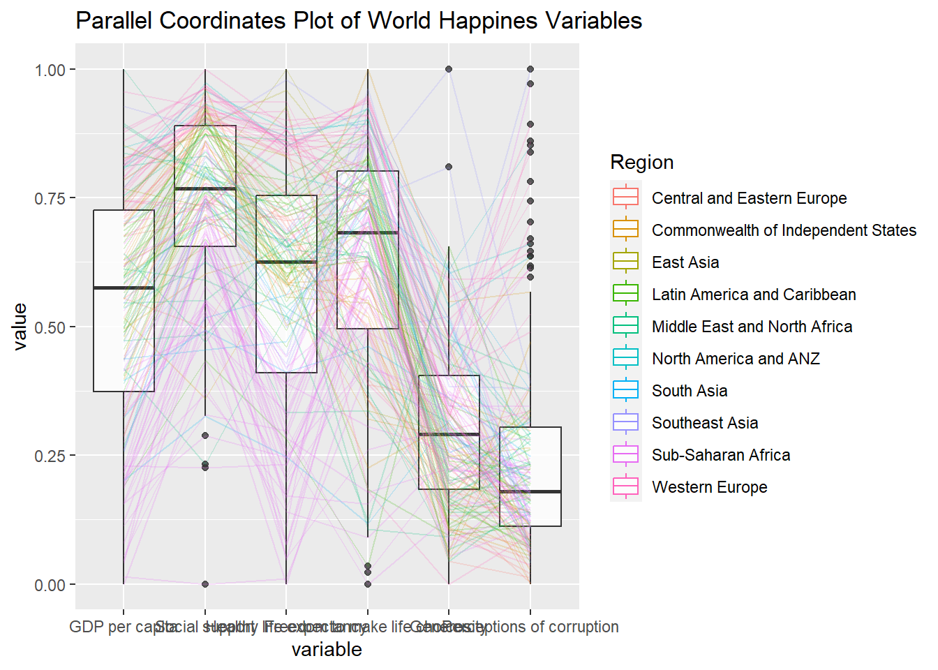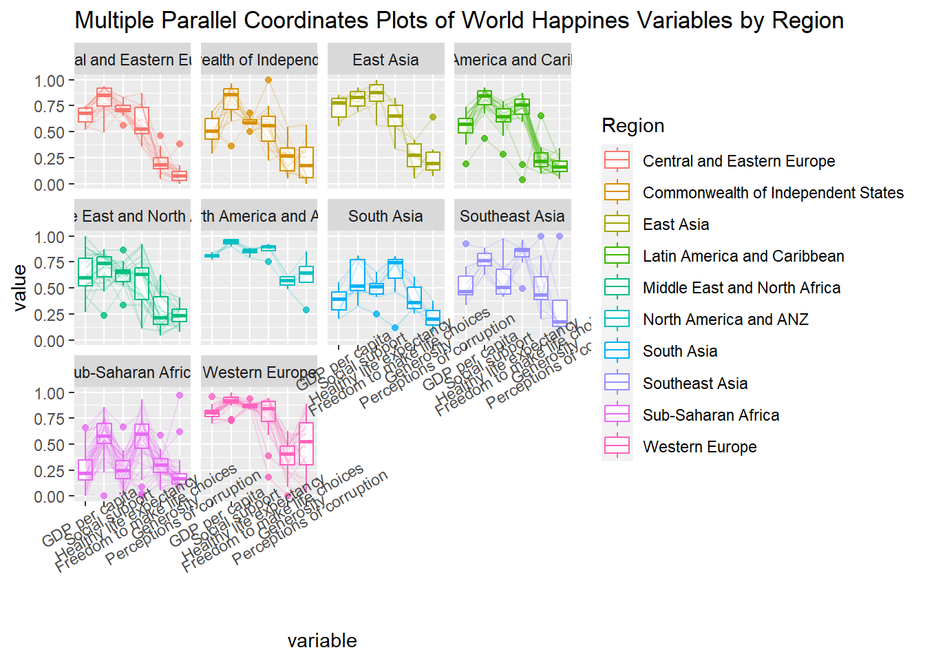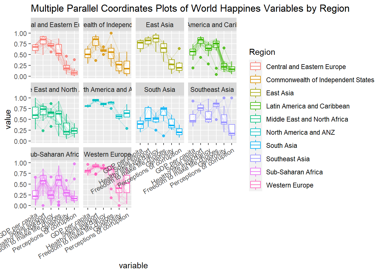 title = "Multiple Parallel Coordinates Plots of World Happines Variables by Region") +