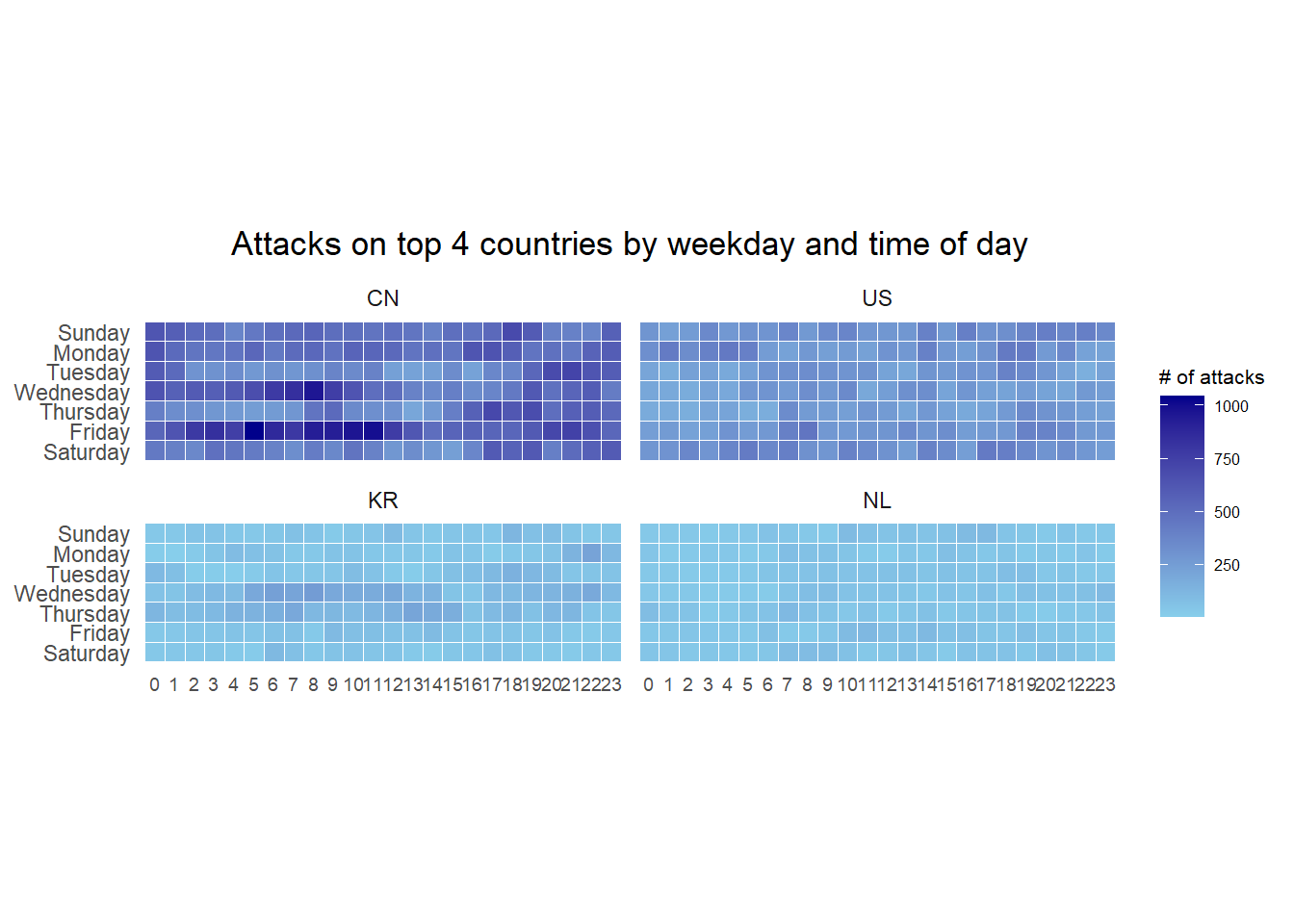 Beside extracting the necessary data into attacks data frame, mutate() of dplyr package is used to convert wkday and hour fields into factor so they’ll be ordered when plotting.
