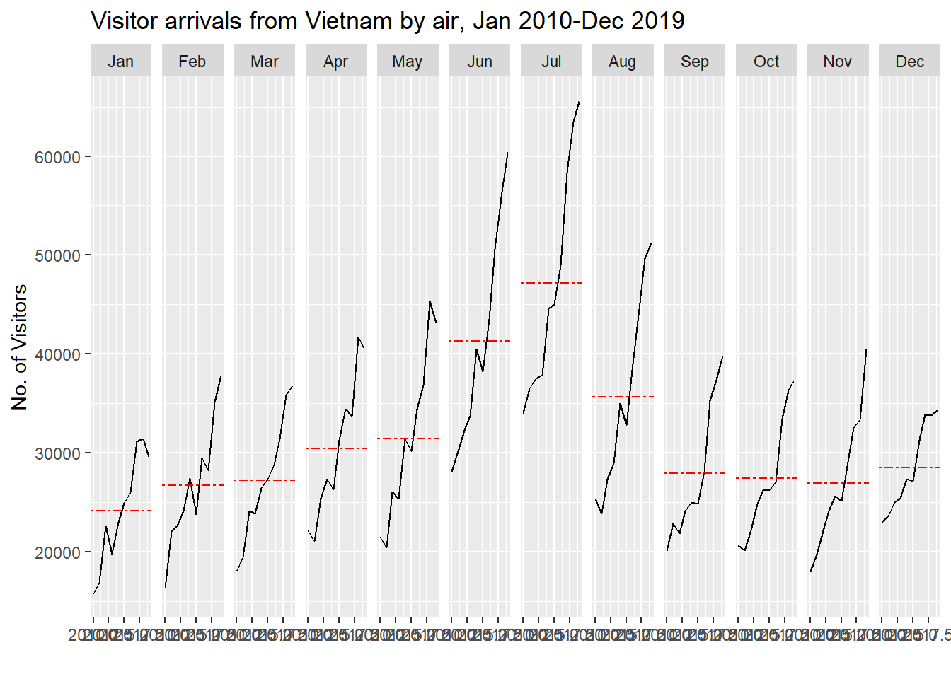 In this section, we will learn how to plot a cycle plot showing the time-series patterns and trend of visitor arrivals from Vietnam programmatically by using ggplot2 functions.