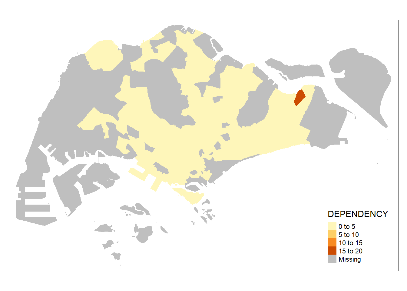Before we get started, it is always a good practice to get some descriptive statistics on the variable before setting the break points. Code chunk below will be used to compute and display the descriptive statistics of DEPENDENCY field.