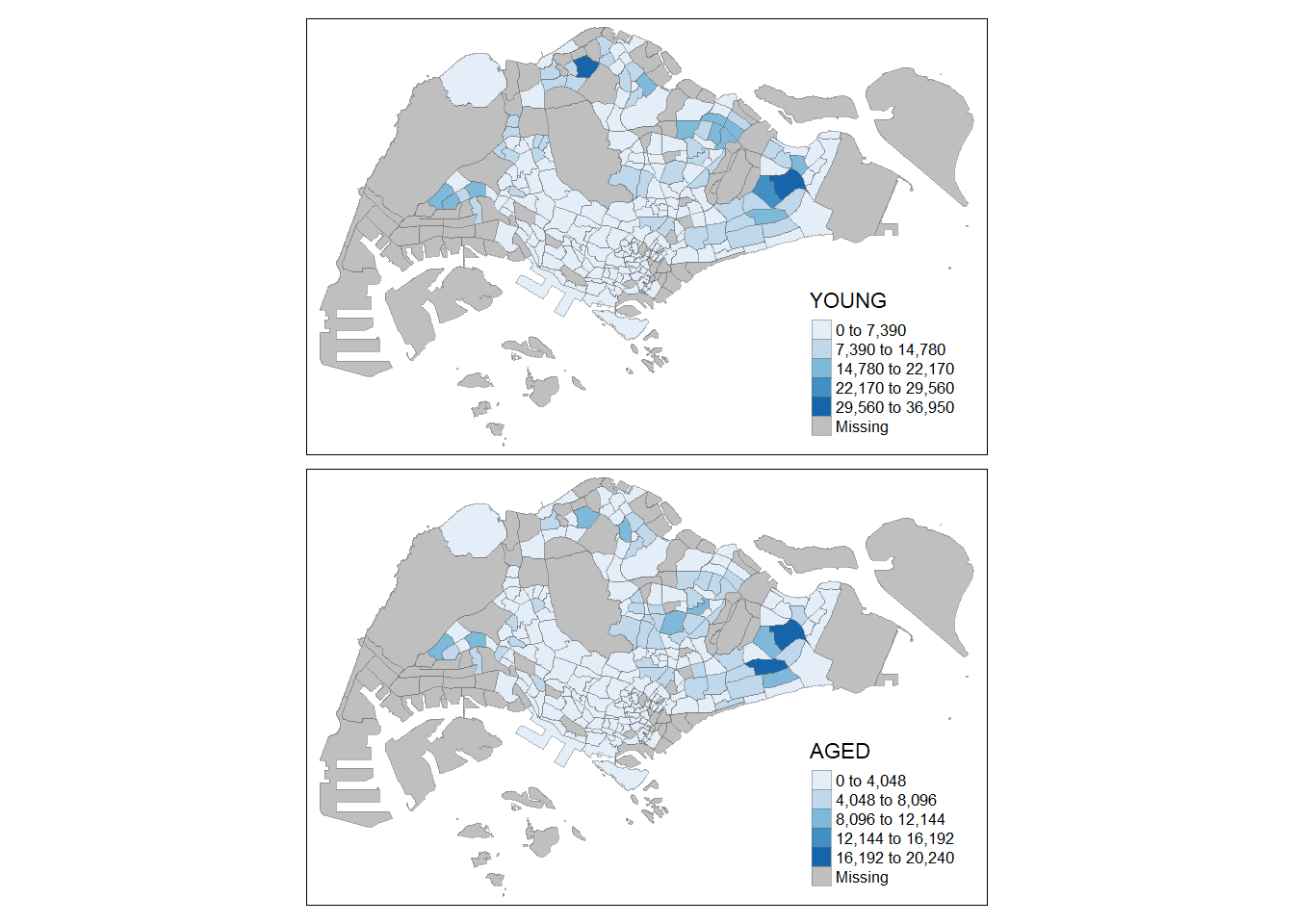Choropleth mapping involves the symbolisation of enumeration units, such as countries, provinces, states, counties or census units, using area patterns or graduated colors. For example, a social scientist may need to use a choropleth map to portray the spatial distribution of aged population of Singapore by Master Plan 2014 Subzone Boundary.