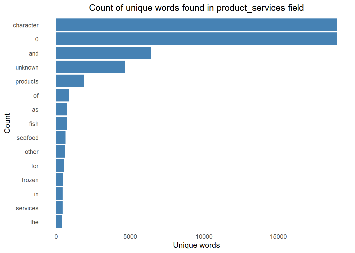 title = "Count of unique words found in product_services field")Therefore, we proceed to remove the stopwords via a function from the tidytext package called stop_words. Note that the anti_join() function from the dplyr package is used to remove all stopwords from the analysis.