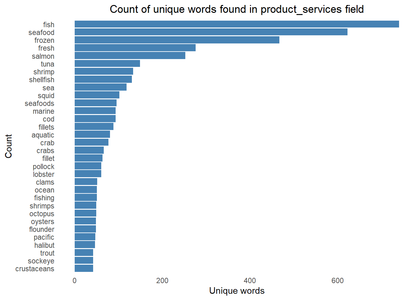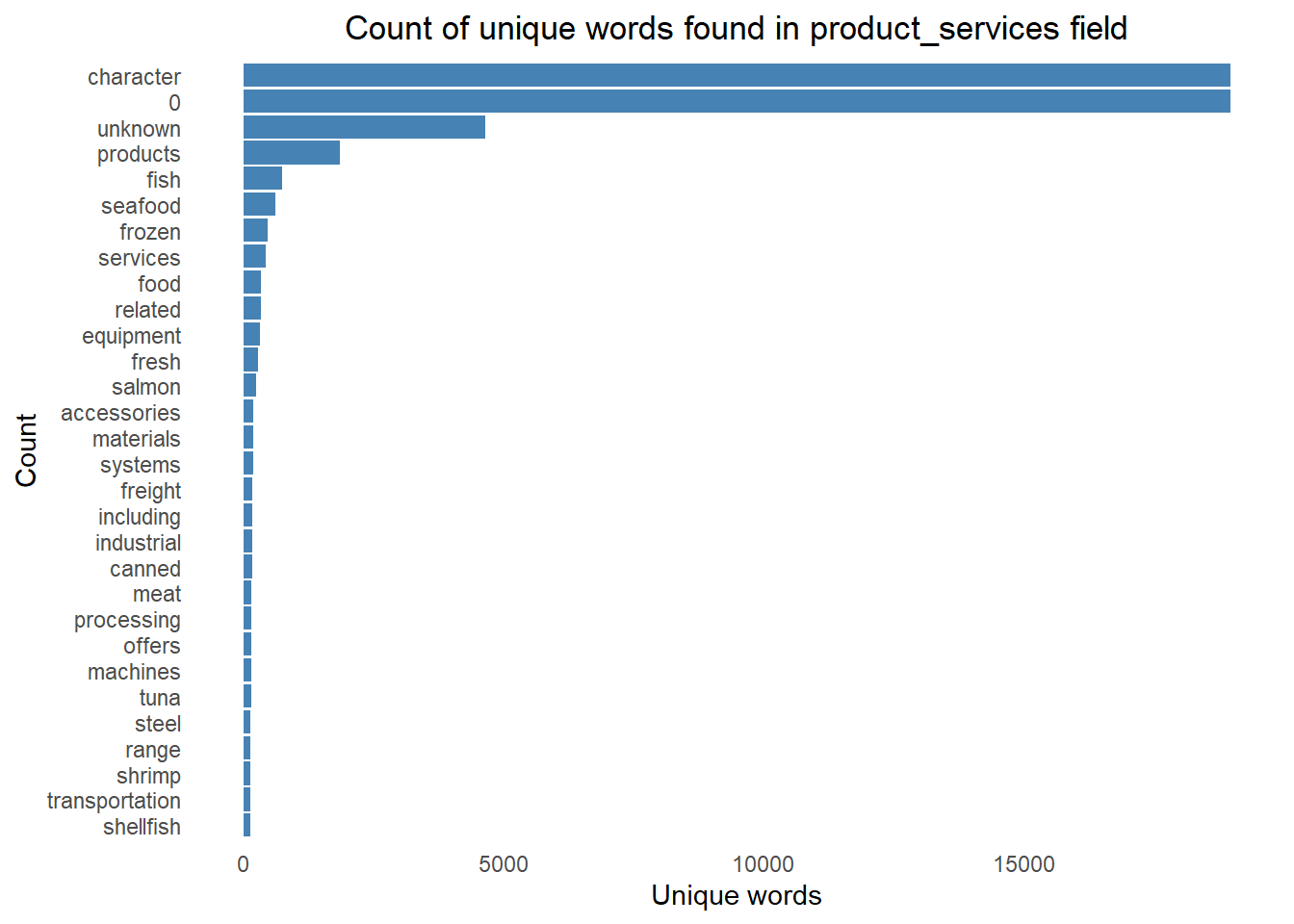 title = "Count of unique words found in product_services field")As such, we proceed to remove words such as “character”, “0”, “unknown” etc. This step was done in an iterative manner to ensure that we capture as most fishery related keywords. We then visualise the top 30 words that are closely related to our analysis scope.