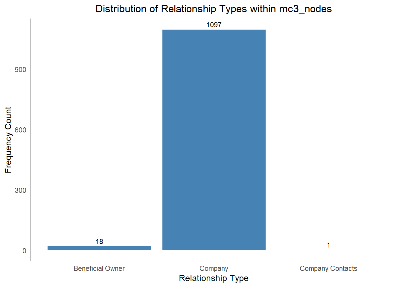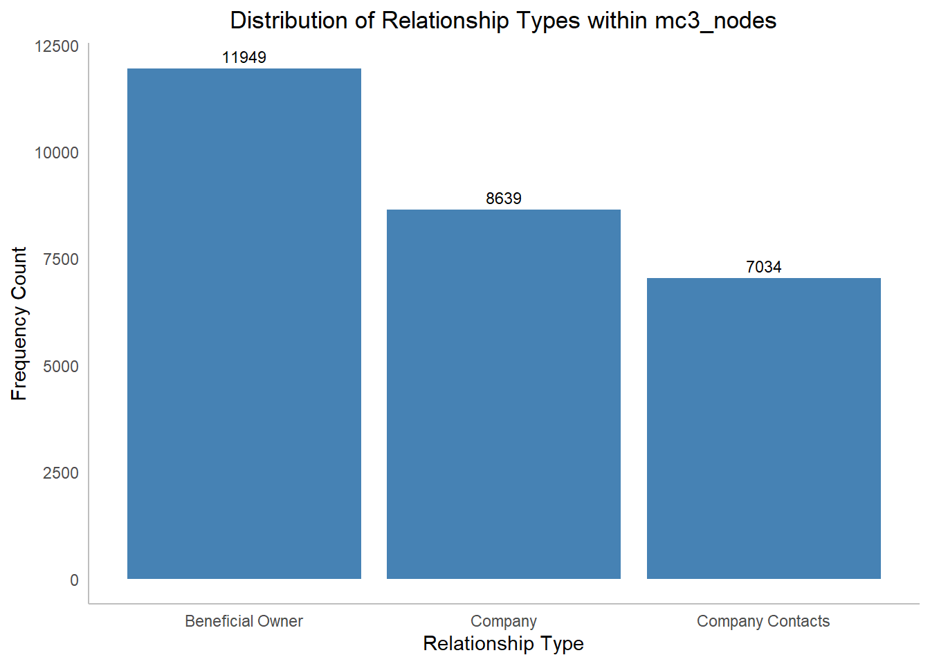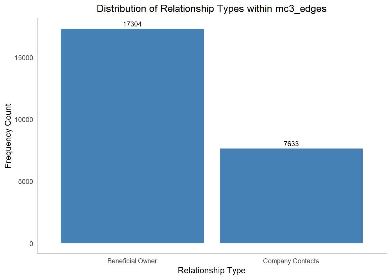 However, when we utilised DT::datatable(mc3_nodes_all) to gain an insight into the other centrality measures. It appears to have relatively low closeness centrality (0.0166667) but high betweenness centrality (1770). This suspicious company is owned by several beneficial owners (possibly to mask the ultimate beneficial owner), with low direct proximity to other companies (indicating a “relatively closed off network”). Yet, it serves as a significant intermediary between other companies in the flow of illegal fishing in the broader network. Hence, the said company can potentially be acting as a bridge to facilitate the illegal fishing network.