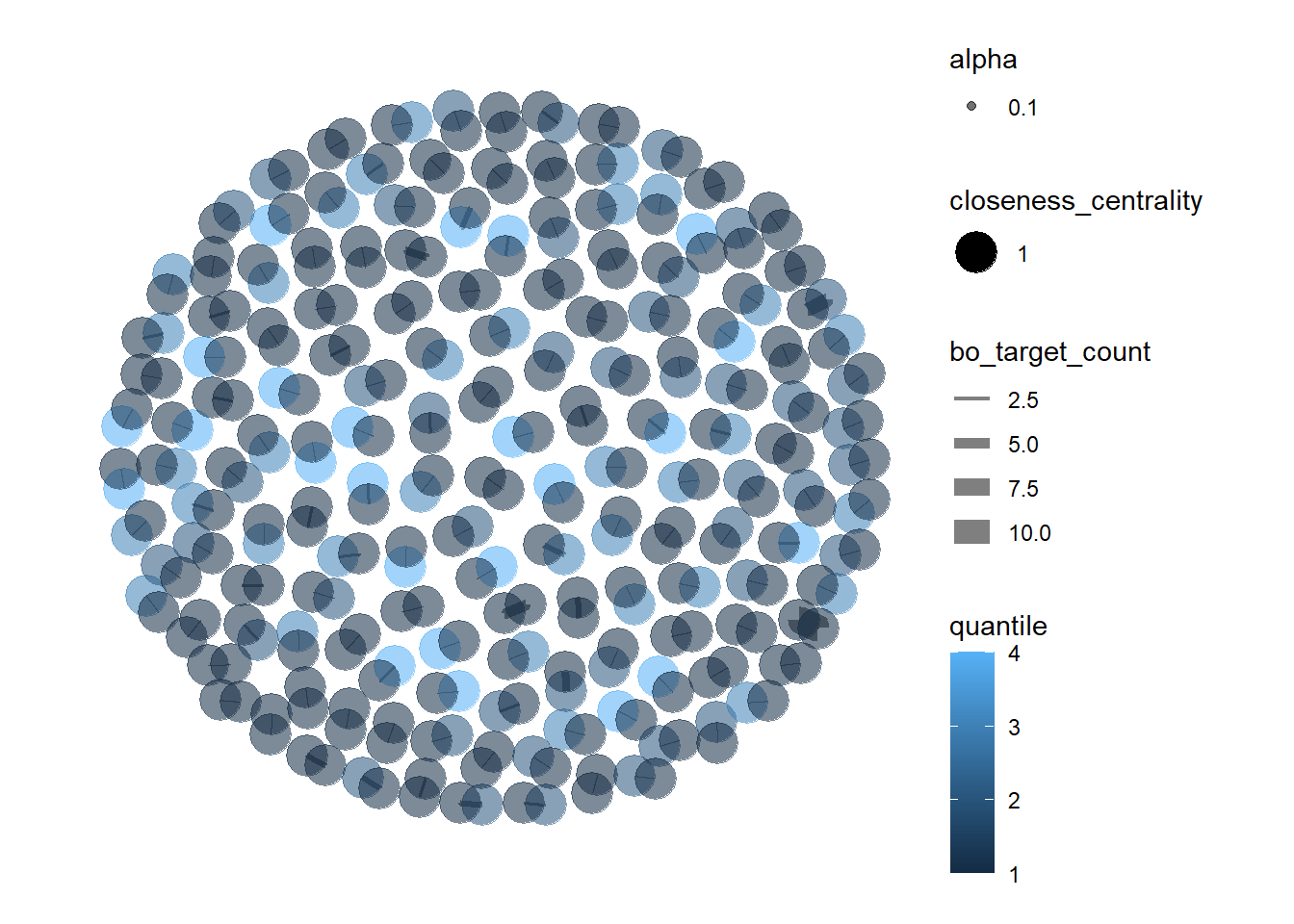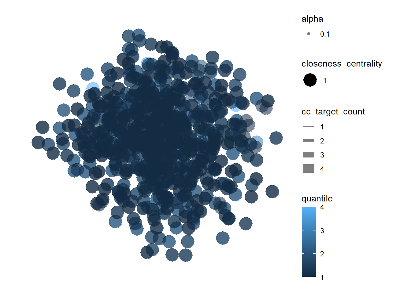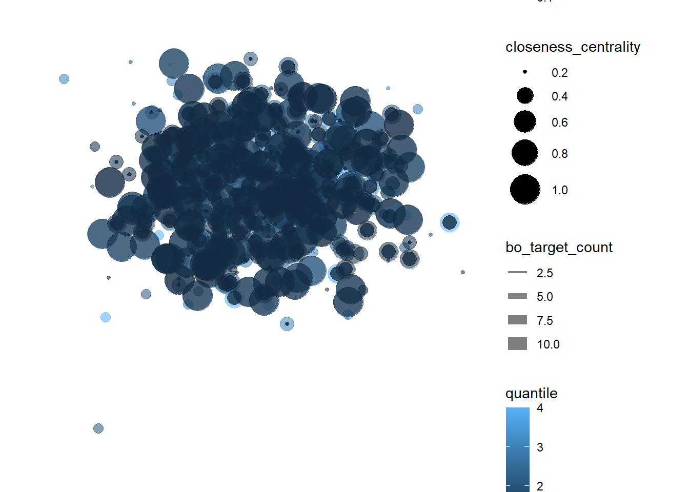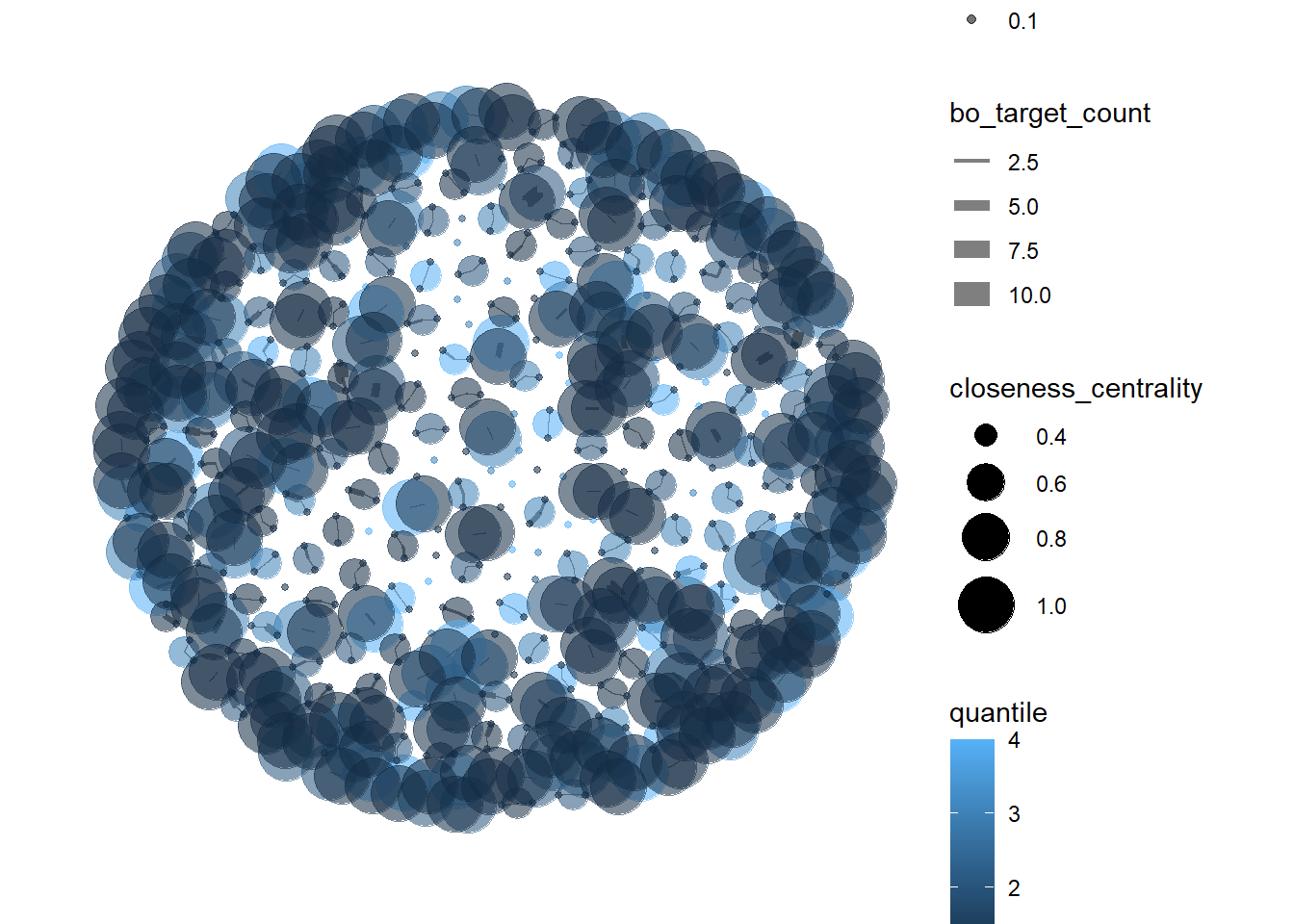 theme_graph()Within this section, we leveraged on top_frac to further filter the mc3_graph_bo data set to the top 30%, 20% and 10% based on closeness_centrality focusing on revenue quantile before determining the appropriate threshold for our subsequent analysis.