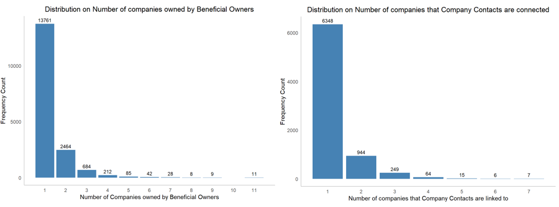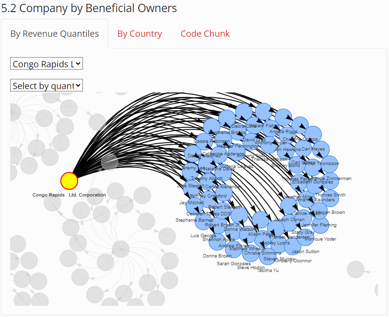 Leveraging on the interactive plots in Section 5, we focused on companies’ connection to beneficial owners and company contacts respectively. Using “Congo Rapids Ltd. Corporation” as an example, we can see that it has connections to several beneficial owners.