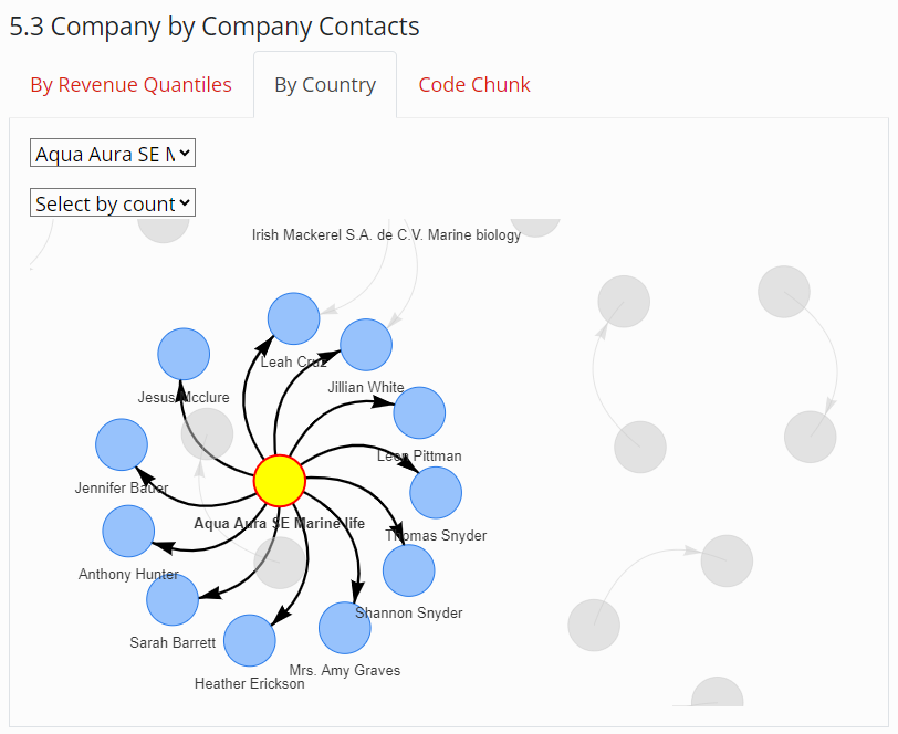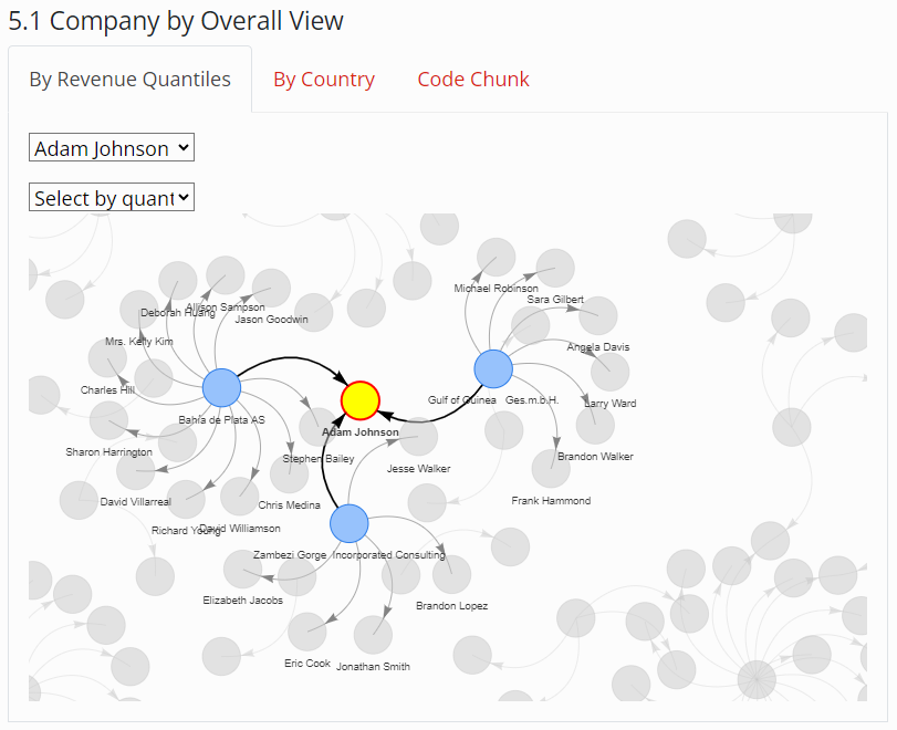 Section 5.3: This section focuses on looking at the interactive network visualisation specifically on company contact relationship with Company by revenue quantiles and country