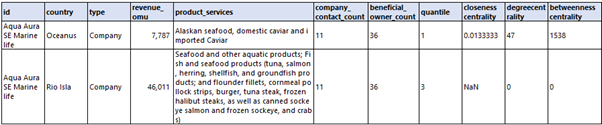 Next, we look at “By Country” perspective. Zooming into Oceanus, which has the second highest count in terms of fishing related companies, we detected “Aqua Aura SE Marine life” as having a lot of company contacts. Companies involved in illegal fishing might potentially be more prone to having a few company contacts to enable a higher revenue stream.